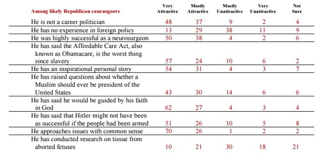 He said Obamacare was as bad as slavery? Attractive to 88 percent. Suggested an unconstitutional religious test for office? 73 percent. Made historically suspect claims about Hitler? 77 percent. There’s almost no way for Trump to outflank Carson on these things.